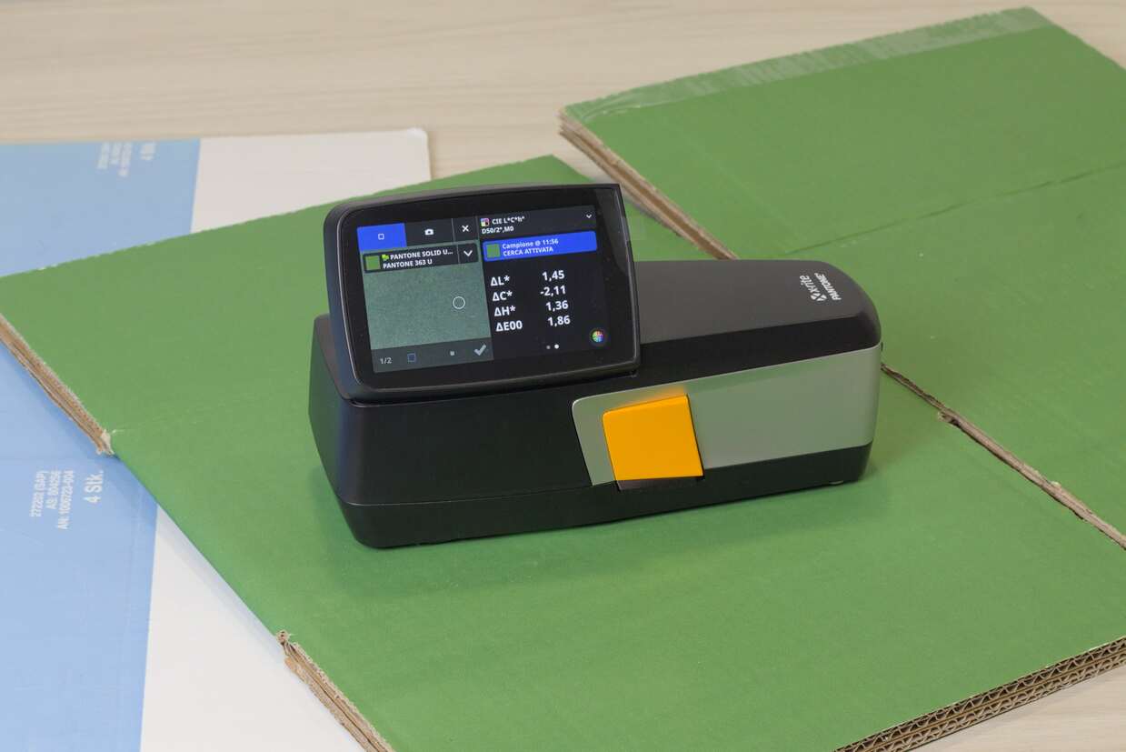 Quando riceviamo un campione di scatola da un cliente con dei colori fuori standard, mettiamo subito in funzione lo spettrofotometro. In circa qualche secondo, questo strumento ci restituisce il codice del colore stampato sul cartone, sia che si tratti di materiale non patinato che di materiale patinato.