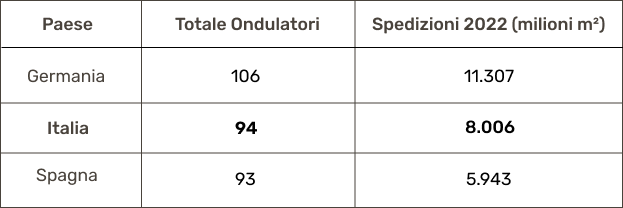 La Spagna, con 93 ondulatori e 5.943 milioni di m² di spedizioni, si colloca al terzo posto: un dato che mostra una capacità produttiva leggermente inferiore all'Italia a parità di ondulatori.