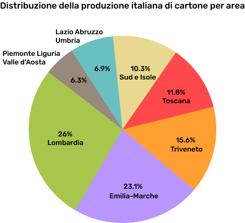 La Lombardia si conferma la regione più produttiva, rappresentando il 26% della produzione italiana di cartone ondulato. Seguono le macro aree Emilia Romagna-Marche (23,1%), Triveneto (15,6%), Toscana (11,8%), Sud e Isole (10,3%), Lazio-Umbria-Abruzzo (6,9%) e Piemonte-Liguria-Valle D’Aosta (6,3%).